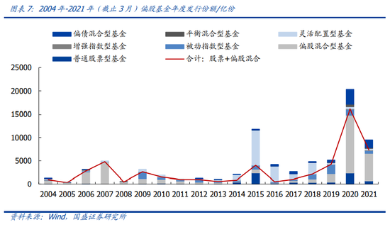 2021年(截止3月)偏股基金(股票型+混合型)共发行9470亿份。其中,股票型+偏股混合型共发行7305亿份。