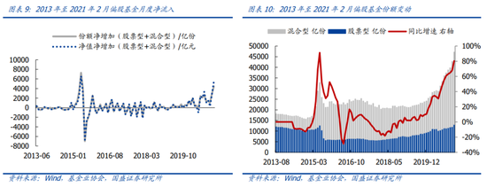 2月偏股基金(股票型+混合型)净增加份额为4477亿份,净增加净值(估算)为5528亿元。根据基金业协会最新月度数据,2月偏股基金(股票型+混合型)份额共47187亿份,较上月净增加了4477亿份;净值共72850亿元,用中证股票基金指数和混合基金指数的收益率来剔除净值变动的贡献后,2月净流入5528亿元。2021年前2月偏股基金(股票型+混合型)净增加份额为7499亿份,净增加净值(估算)为8386亿元。