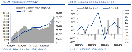 2月私募证券基金净流入82亿元。根据基金业协会最新月度数据,2月私募证券投资基金资产净值为4.4万亿元,基金只数为57539只,较上月增加410亿元、1378只。假设私募78%股票仓位,并用前2月私募基金累计收益率2.31%剔除净值变动贡献,2月私募净流入82亿元,2021年累计净流入达到4273亿元。