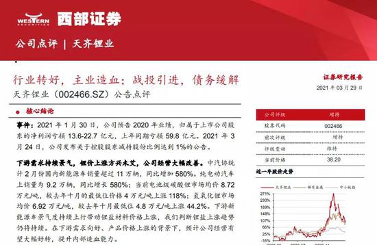 同样也是在3月29日,西部证券发布对天齐锂业的公司点评研报称:“随着行业供需转好及外部战投引进,公司债务风险有望大幅缓解,主业经营持续好转,维持增持评级。“