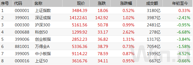 4月2日,沪深两市再度反弹,截至收盘,上证指数涨0.52%报收于3484.39点;深成指涨1.02%报收于14122.61点;创业板指涨1.31%报收于2852.23点,万得全A总成交7054亿。