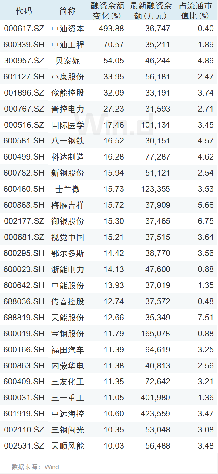 在两融余额高位震荡的同时,部分公司融资余额亦快速增加。Wind统计显示,本周前四天,有27只个股融资余额增长超过10%、最新融资余额超3亿元。具体来看,中油资本融资余额增幅达493.88%,位居第一;此外,中油工程、贝泰妮、小康股份、豫能控股、晋控电力等公司融资余额增幅均超过20%。