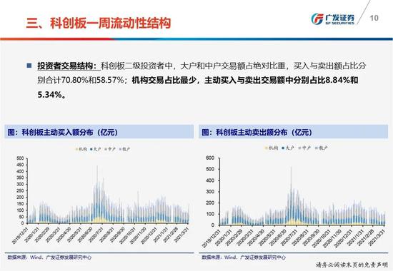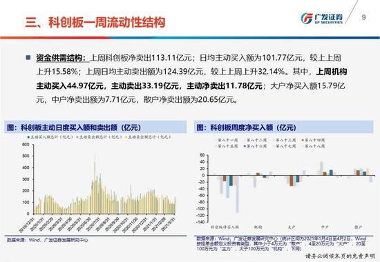 一周流动性结构:(1)上周科创板净卖出113.11亿元,机构主动卖出11.78亿元;(2)机构上周主动买入与卖出交易额中分别占比8.84%和5.34%;(3)上周四融券余额为155.27亿元,相较上上周五上升4.56%,融券/融资余额比为0.49。