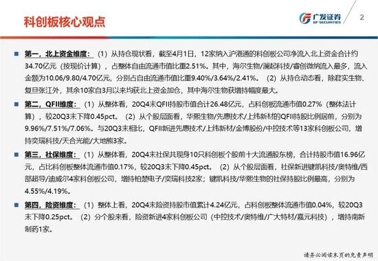 第三,社保维度:(1)从整体看,20Q4末社保共现身10只科创板个股前十大流通股东榜,合计持股市值16.96亿元,占比科创板整体流通市值0.17%,较20Q3末下降0.45pct。(2)从个股层面看,社保新进键凯科技/奥特维/西部超导/迪威尔4家科创板公司,增持柏楚电子/奕瑞科技2家;键凯科技/华熙生物的社保持股比例最高,分别为4.55%/4.19%。