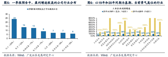 ●财报季来临,哪些行业在一季度的盈利可能超预期?已发布一季报预告的205家公司,21Q1的盈利增速中位数达到了143%。盈利增速高于中位数的公司主要集中于化工、电子、机械设备。结合1-2月份的宏观数据侧面观察。从工业企业利润来看,筛选2021年1-2月相较2020年同期和2019年同期增速均超过整体工业企业利润增速的行业作为景气的主要拉动项,该类行业主要集中于上游原材料;以及中游制造的化工、造纸、专用设备、汽车、以及计算机电子设备等。