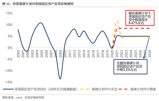 一个简单的测算:2012年至2019年,美国固定资产增速中枢在5.3%左右(年化5.32%,增速平均5.34%),占GDP增速约20%(平均20.1%,中位数20.2%)。由于20年固定资产投资数据未出,我们暂以GDP数据倒推,同时21年同比增长考虑基数效应随GDP调高;基建计划中扣除非固定资产投资部分(家庭护理、人才培训、公平就业)剩余1.84万亿,则理论上能使未来8年美国固定资产投资增速中枢提升3.17%左右。