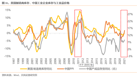 ⑧本轮PPI二次冲顶的推动力之二(外部因素):中外政策周期出现错位,中国信用周期领先于海外见顶。美国制造商补库刚刚开始,而历史数据显示海外补库与国内补库、国内工业品价格之间存在联动。
