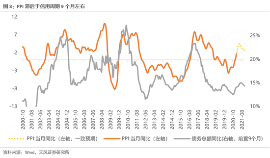 由此来看,判断本轮顺周期行情的持续性,核心就在于PPI的后续走势。而经验数据表明,PPI数据与信用周期高度相关。我们仍然以债务总额同比来衡量信用周期,可以看到PPI大概滞后于信用周期9个月左右。