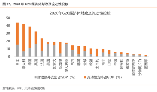 根据IMF财政投放(额外支出或主动放弃)+流动性支持统计口径,截止2020年末(不包括美国最新1.9万亿和基建计划),G20经济体中日本、意大利、德国、英国为应对疫情投放规模最大,占GDP比重均超过30%;美国投放规模占GDP比重为19.1%(若算上1.9万亿约为28%);而中国本轮投放规模占GDP仅6%,在G20国家中处在靠后位置。