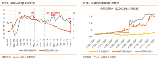 10年3月美国结束QE1之后,复苏斜率有所放缓。更关键的是,由于大量资金滞留于金融体系,实体部门失业率仍然高居不下。QE1结束后的半年里,美国失业率始终维持在9.4%以上,直接促成10年11月QE2的启动。QE2持续的8个月时间里,美联储以每个月750亿美元、合计6000亿美元的规模购买美财政部发行的长期债券,压低美债长端利率,创造更优的融资环境,拉动制造业复苏,改善失业率。伴随QE2,美联储自10年末起二度加快扩表,外部流动性环境改善。