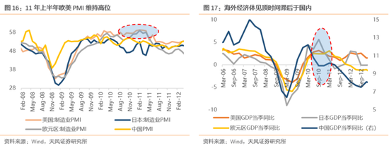 10年下半年国内经济数据在政策周期转向的作用下走弱,但海外主要经济体仍处在修复过程中(金融危机下海外经历了至少一年的负增长,修复过程也更加漫长)。GDP数据来看,中国10Q1见顶,美国和日本10Q3见顶,欧元区则到11Q1才见顶;PMI数据来看,10年四季度至11年上半年,国内PMI数据在荣枯线上方小幅走弱,日本趋弱,美国和欧元区则在这一阶段持续上行。