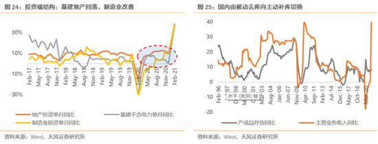 投资分项来看,去年疫情冲击后同样是基建和地产率先修复;下半年货币政策边际收紧,基建数据首先回落,“三道红线”等政策连续调控之下地产投资也在去年四季度见顶,今年多城市加码调控的背景下大概率进一步回落;而制造业投资则处于复苏的初期,去年8月制造业投资单月同比翻正,全年同比仍为负数,今年1-2月在基数效应下大幅回暖(异常值),后续同比数据料回落,但中枢将较去年明显上移。