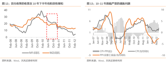 国内政策转向的原因在于日益严峻的滞胀问题。“猪油共振”之下,10年初CPI和PPI继续快速上行。此后连续3次升准缓和了价格上涨压力,CPI二季度斜率小幅放缓,PPI第一次见顶。同时由于10年二季度以来经济增速放缓,货币政策在10年三季度阶段性回暖,6-10月也没有升准、加息动作,M2增速在下半年小幅回升。
