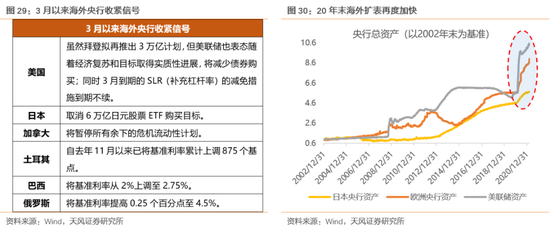 类似于10年上半年,国内信用周期已经见顶回落,海外也出现了一些防止过热和通胀的信号。3月以来以土耳其为典型,部分经济体采取了加息或者削减刺激规模的行动。但更为关键的美国和欧元区态度仍然偏鸽。欧债危机的教训使得欧元区对过早停止宽松保持相当的警惕,尤其是在核心通胀还没有明显抬升、尚未走出疫情封锁状态的情况下;3月初欧央行还表示将加快紧急购债,欧元区扩表比金融危机时期更加积极。美国方面短期透露SLR到期不续和可能减少债券购买的信号,但中期看,拜登任内势必加重基建筹码,美联储方面也表示目前实际失业率远高于数据显示;央行资产负债表来看,随着9千亿+1.9万亿政策落地,美联储也出现了类似10年末二次加快扩表的情况。