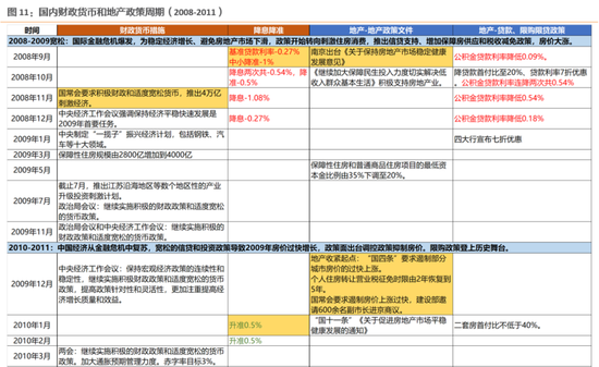 在及时的政策救助之下,中国GDP增速于09年一季度见底(PMI 08年11月即见底),是较快走出金融危机冲击的经济体之一。伴随经济数据的迅速恢复以及通胀压力、楼市过热压力来袭,09年以来政策投放逐步走向谨慎(09年没有降息降准),并在09年末至10年初完成由宽松向紧缩的切换。09年12月地产调控以“国四条”为标志开启,10年4月限购限贷政策登上历史舞台;10年1月央行升准,3月政府工作报告提出要加大通胀预期管理力度。