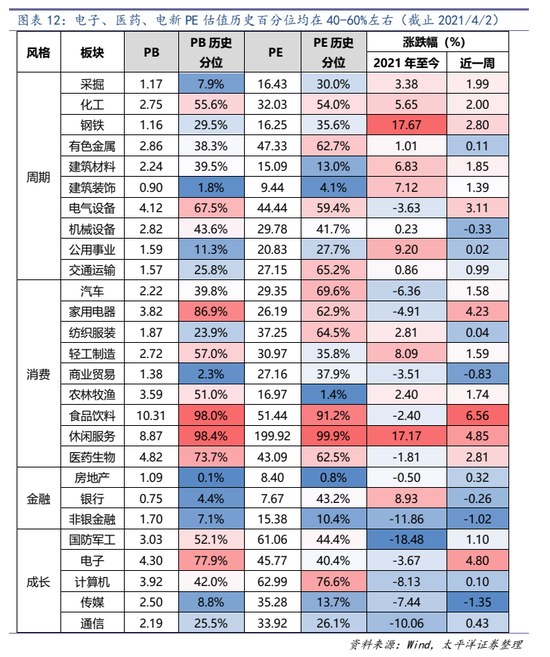 市场情绪得到边际修复,但股相对债吸引力仍不足。随着白马抱团股的止跌企稳,市场呈现出更有力度的反弹。截止4月2日,市场情绪得到边际修复。从换手率来看,沪指、沪深300、创业板等权重指数换手率均处于历史较低水平;目前2021年3月日均成交额8055亿元,较2月明显回落,但相对于2020年9-12月日均7700-8300亿元的成交水平仍偏高;融资余额回落,4月2日最新融资余额达1.51万亿,较1月下旬高点的1.57万亿仅有小幅回落,但融资占成交额比重8.33%,较3月底8.10%回升;截止4月2日,股票风险溢价ERP达3.31%,历史百分位59.5%,反映当下股票预期的收益率相较于债券的吸引力有所提升但仍不足。
