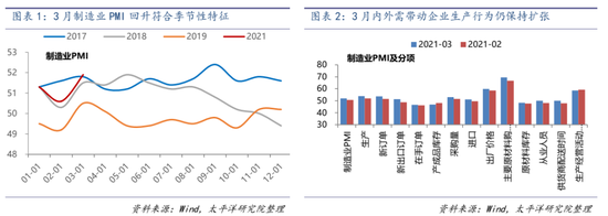 3月制造业PMI指数51.9,较2月回升1.3,符合历史上的季节性表现,显示经济修复仍在,侧面验证此前2月PMI的下滑也属于季节性回调。其中,PMI生产指数由上月的51.9升至53.2,新订单指数和新出口订单也分别回升至53.6、51.2,处于景气高位,结合从业人员提升2至50.2,显示海外供需缺口和国内就地过年后复工加快,内外需带动企业生产行为仍保持扩张;产成品库存由上月的48.0回落至46.7,而原材料库存较上月相比增加0.7至48.4,采购量回升,呈现需求带动销售好转而被动去库存;出厂价格指数和主要原材料购进价格均出现大幅上涨,创年内新高,分别升至59.8和69.4,主要受近期国际大宗商品震荡上行(美国2万亿基建刺激预期)、国内钢铁煤炭价格上涨(唐山限产)影响。