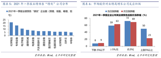 从行业来看,目前2021年一季报业绩增速靠前的企业较多来自受益经济复苏中生产扩张和出口的化学制品、通用机械行业;此外,受益于疫后设备资本开支的专用设备、通信设备等中游制造类行业的企业也较多;受益行业景气提升,电子制造、电源设备、汽车零部件等苹果产业链和新能源产业链相关企业高增速的也较多。结合市场股价反应来看,多数公司在公布高增长业绩后,市场股价反应偏积极,多数“绩优”公司在业绩预告当日均能取得正收益,且在业绩公告后次日多数公司仍能保持正收益,显示近期市场对业绩较强的关注度。