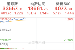 截至发稿,美国三大股指上涨,道指涨1.22%,纳指涨1.34%,标普500涨1.44%。