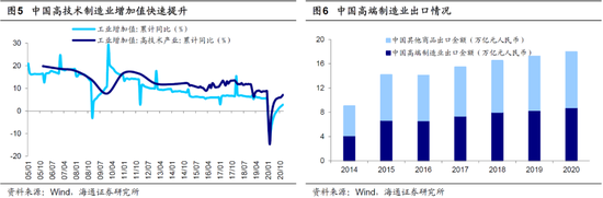疫情影响为中国智造弯道超车提供契机。近年来,经济全球化发展动力衰减,08年金融危机、逆全球化思潮盛行、中美贸易摩擦等一系列冲击下,单边主义和贸易保护主义抬头、国际间的开放发展和要素自由流动受阻。20年新冠肺炎疫情全球蔓延,更对全球产业链、供应链的稳定性造成严重冲击。在内外局势十分严峻的背景下,习总书记提出推动形成以国内大循环为主体、国内国际双循环相互促进的新发展格局。我们判断以国内大循环为主体不仅是全球贸易受阻、产业链和供应链中断背景下的权宜之计,更是实现产业链高级化和现代化、培育新形势下我国参与国际合作和竞争新优势、走高质量发展之路的应有之义。同时,疫情也加快了我国制造业走向世界舞台中心。由于对疫情防控得力,我国3月后国内复工复产陆续推进,工业生产总值累计增速从2020年2月的低点-25.9%持续回升至12月的7.3%。而海外疫情持续蔓延,工业生产持续停滞。国内外疫情和复工复产的时间差为我国的出口创造了重要的时间窗口,当疫情破坏全球大部分国家的生产供给能力时,我国完整的产业链承担起了全球供应中心的角色,2020年2月中国出口同比增速下滑至-40.6%后快速恢复,11月一度上升至20.6%的高位。近几年我国货物出口总额占全球出口的比重基本在12%-13%左右,但是2020年3-7月我国货物出口全球占比上升至15.6%左右,特别在医疗器械、消费电子、新能源设备、高端装备制造领域中,我国完善的产业链在海外供给中断的背景下抢占了很大一部分发达国家/地区的出口份额,例如医疗器械2020年出口金额同比增速为40.4%、平板电脑为22.6%、风力发电机组为16.9%、集成电路为14.8%。