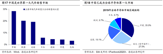 市场层面看,“双循环”新发展格局下,国内市场将更加强大。3月发布的《第十四个五年规划和2035年远景目标纲要》强调扩大内需,逐步形成以国内大循环为主体、国内国际双循环相互促进的新发展格局。“双循环”新格局下,我国幅员辽阔、人口众多,许多行业拥有广阔的市场空间和发展前景:第一,我国已成为世界第一大市场,2019年我国社会消费品零售总额达41.2万亿元,市场红利突出。以汽车和半导体行业为例,2019年我国汽车销量占全球汽车销量的28%、我国半导体市场占全球半导体市场规模的比重达35%,均是全球第一大市场。第二,我国城乡、东中西部地区发展的不平衡形成了多层次的需求结构。第三,产业转移正在国内区域间发生。根据“雁阵模式”,劳动密集型制造业将转移至拥有劳动力成本优势的地区,疫情和逆全球化趋势下,国际贸易和产业转移受到抑制,但我国东、中、西部地区发展存在差异,在国家区域发展战略与促进产业转移政策的推动下,中西部承接产业转移的规模快速增大。第四,我国产业链集群优势突出,制度建设不断完善,制造业稳定性和竞争力不断提高,具备“一站式服务”和“即时生产(just-in-time)”的优势。特斯拉上海工厂扩产、霍尼韦尔在武汉新建创新中心等均从侧面印证我国制造业正由低端向高端转型。