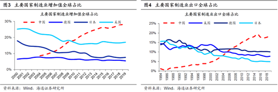 结构上看,中国制造业仍大而不强、高端制造领域仍薄弱。改革开放以来,中国制造业重心实现了从纺织品、简单电子产品向机电产品、重工业装备的转变,部分领域逐渐崭露头角:高技术制造业增加值由2004年的6665亿元增加至2020年的47274亿元,在规模以上工业增加值中的占比由10.1%提高到了15.1%,高新技术产品出口金额占比由2000年的15.0%上升至2020年的30.0%。虽然中国制造业全球价值链地位正逐渐从低端向中高端攀升,制造业从劳动密集产业主导向资本、技术密集型产业转变,但制造业结构和质量较发达国家仍有很大差距。根据中国工程院等发布的《2020中国制造强国发展指数报告》,从规模、质量、结构等多个指标综合看,中国制造业整体水平处全球第四,处美国、德国、日本之后,分项指标看规模指标位列第一,但质量及结构指标仅列第七和第四位。值得注意的是,近年来西方国家对中国科技领域的封锁暴露了中国制造业大而不强的窘境,在半导体、精密仪器等高精尖制造领域缺乏核心竞争力,2019年中国芯片进出口金额分别为3055/1016亿美元,芯片贸易逆差达2039亿美元,高端芯片严重依赖进口,2017-2019年中国高端芯片进口金额达2007、2492、2371亿美元,占全年总进口量比例均大于77%。生物医药领域中国与欧美差距也较大,根据IPRdaily发布的数据,2019年全球生物制药产业发明专利前100强中,中国仅有7家企业,其中专利数量最多的恒瑞医药也仅排名18(373件),而排名第一的瑞士Roche专利数量达2082件。