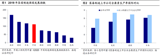 总量上看,中国制造业已经实现规模优势。制造业是指通过制造过程,生产为可供人们使用的大型工具、工业品与生活消费产品的行业。制造业从根本上决定着一个国家的综合实力和国际竞争力,同时也是一国科技实力和工业能力的集中体现,在发达国家国民经济中占有重要份额,也是发展中国家经济增长的主要引擎。改革开放以来,中国制造业实现了从小到大,2019年中国的名义GDP是美国的0.66倍,而制造业增加值是美国的1.64倍。根据国家统计局的最新数据显示,2020年我国工业增加值达到31.3万亿元,其中制造业增加值达26.6万亿元,同比增速达3.4%,国家统计局局长宁吉喆预计我国制造业增加值将连续第11年居世界第一位。横向对比来看,2019年中国制造业增加值38963.5亿美元,全球占比达28.1%,主要制造业强国美国制造业增加值18733.2亿美元/占比13.5%、德国7477.3亿美元/5.4%、日本10379.7亿美元/7.5%;制造业出口方面,2019年中国制造业出口规模23252.8亿美元,全球占比达18.3%,主要制造业强国美国9701.3亿美元/占比7.7%、德国12671.1亿美元/10%、日本6111.8亿美元/4.8%。根据刘兴国所著《2020中国制造业企业500强分析报告》,中国制造业500强企业资产规模的入围门槛已从2016年65.4亿上升至2020年100.7亿,总资产规模由2016 年的29.07 万亿元提升到2020年的39.19 万亿元;此外科技创新方面也愈发得到重视,2020中国制造业企业500 强共有479家企业提供了完整研发费用数据,研发费用总规模达到7677.2 亿元,较2016年5379.6亿元上升42.7%,拥有专利总数从2016年40.6万件上升至2020年95.2万件。