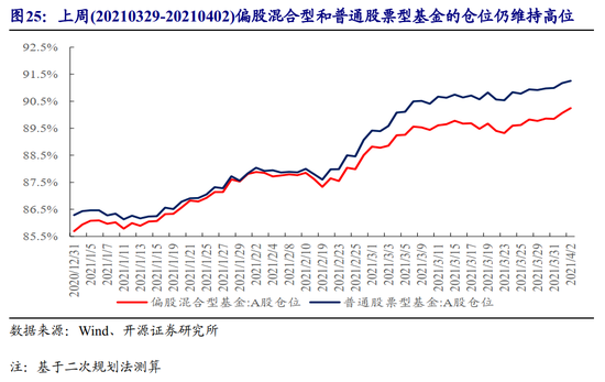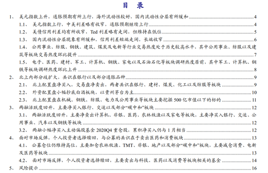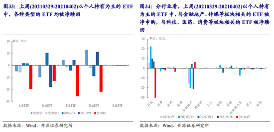 上周(20210329-20210402)偏股混合型/普通股票型基金的仓位仍维持高位,主要加仓农林牧渔、有色、TMT、非银、钢铁、军工、交运、地产以及煤炭等板块,主要减仓家电、电新、消费者服务、食品饮料以及医药等板块。上周货币型ETF被小幅净申购,这意味着上周货币型基金整体可能仍被净申购,同时近期7天理财预期收益率相对于货基收益率下行,且上周以个人持有为主的股票ETF被持续净赎回,这意味着货基可能同时吸纳了来自7天理财和偏股基金的赎回资金。随着市场反弹,个人投资者选择赎回,“负反馈”正在发生。分行业看,在以个人持有为主的ETF中,与金融地产、传媒相关的ETF被净申购,与科技、医药以及消费等板块相关的ETF被净赎回,这意味着上周反弹较多的科技、医药、消费板块的“抛压”可能较大。结合主动基金在上周的加仓行为来看:TMT是公募主要加仓板块,而以个人持有为主的ETF中,与科技板块相关的ETF被较大幅度净赎回,公募与其负债端(个人)的分歧在扩大,公募与其负债端(个人投资者)的共识在于卖出医药和消费板块。结合相对稳定的北上配置盘来看:公募与其主要对手盘(北上)的分歧仍较大,但在部分TMT以及部分“碳中和”板块的共识在深化。此外,主动偏股公募依旧选择减仓银行板块,而北上配置盘仍在“坚定”买入。以北上交易盘和两融为代表的趋势交易者则均表达了对银行和部分“碳中和”板块的认可,这意味着当下市场在“碳中和”板块上的共识正在深化。