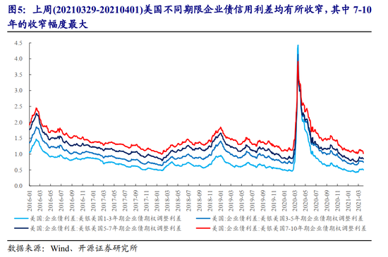 上周(20210329-20210402)美元指数上行,截至3月30日,美元多头/空头头寸规模均继续上升,净多头有所回升,中美利差略有收窄,美债名义/实际利率均有所上行,其背后反映的通胀预期继续上升。对于海外而言,上周美国不同期限/等级企业债信用利差均收窄,Ted利差略走阔,但仍维持低位,美国金融系统流动性整体仍较充裕;对于国内而言,上周流动性分层有所缓和,信用利差短端大多走阔,长端均收窄。交易热度上,上周公用事业、纺服、钢铁、建筑、煤炭、电新等行业交易热度处于历史较高水平,且公用事业、纺服、建筑等板块的交易热度环比仍在提升。调研上,电子、医药、建材、军工、计算机、钢铁、家电、石油石化等板块调研热度居前,其中军工、计算机、钢铁等板块调研热度环比上升。