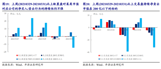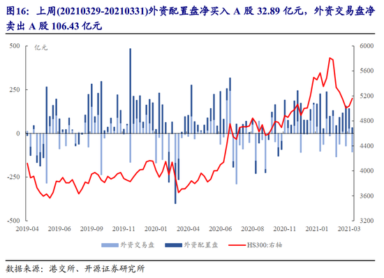 上周(20210329-20210402)外资配置盘净买入A股32.89亿元,外资交易盘净卖出106.43亿元。行业上,北上配置/交易盘的分歧在扩大,两者共识在于净买入银行、建材、煤炭、化工、纺服等行业,同时净卖出医药、汽车、有色、农林牧渔、军工等行业。对于白酒板块,外资配置盘小幅抄底白酒板块(+2.26亿元),以贵州茅台为主(+2.07亿元)。分市值看,上周北上配置盘在机械、钢铁、纺服、电力及公用事业等板块主要挖掘500亿市值以下的标的。