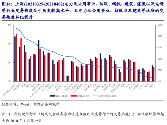 1.4 公用事业、纺服、钢铁、建筑、煤炭及电新等行业交易热度处于历史较高水平,其中公用事业、纺服以及建筑等板块交易热度环比提升