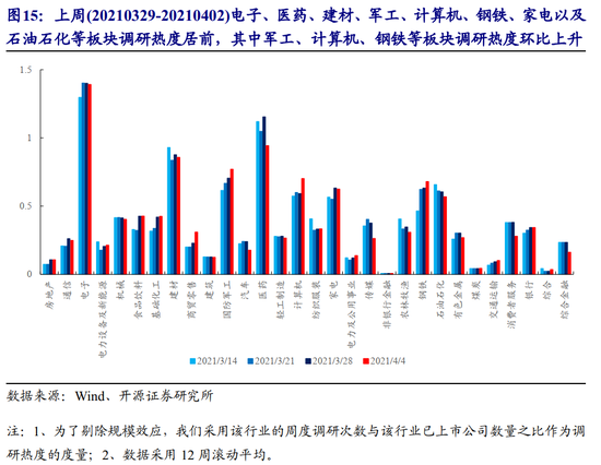 1.5 电子、医药、建材、军工、计算机、钢铁、家电以及石油石化等板块调研热度居前,其中军工、计算机、钢铁等板块调研热度环比上升