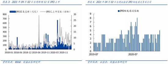 2021年04月02日当周,新增11家IPO上市,首发募集规模合计约为54.92亿元,新增IPO企业数与IPO募集规模较上期小幅回落,但仍维持高位运行,同时证监会当周核发通过5家IPO,核发节奏保持平稳。