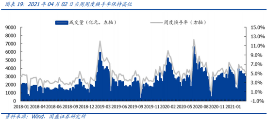 换手率和涨跌停个股数比值可以间接反映市场的活跃度和风险偏好情况。2021年04月02日当周,A股的周度换手率为5.29%,环比小幅回落;涨跌停个股数比值由上期的4.36回落至3.77,涨跌停比值继续保持高位,分化情况显著。