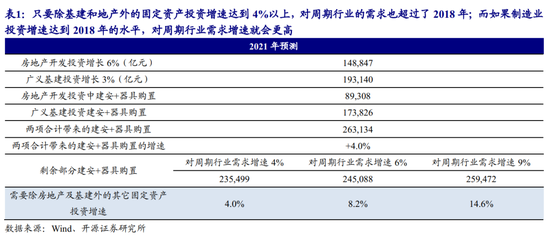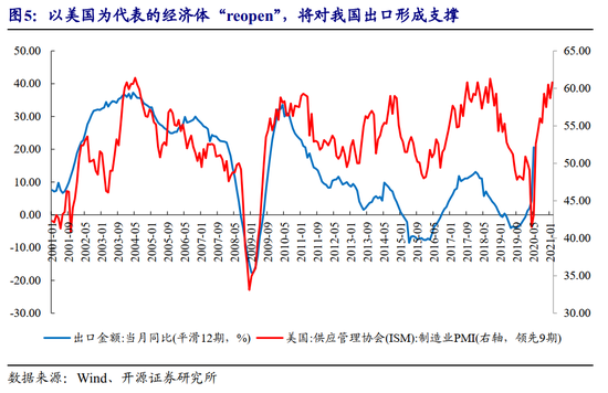 押注经济转型与格局改善的资产成为过去全市场投资者的主流组合,投资者更倾向于作“经济下行”的判断,另一方面,市场在过往重拐点、轻斜率的思维框架下,也更倾向于在社融拐点后对经济的持续改善与景气扩散不进行定价。对于上述两个层面,实际上都存在着乐观的理由:一方面,市场对基建、地产投资下滑预期充分,但从量化测算来看,即使在对这两者维持谨慎假设下,以制造业为主导的其他固定资产投资也会拉动对周期行业的需求增速(建安工程+设备购置)达到6%以上,超过了2017年。另一方面,出口已经从2020年11月份以来成为经济重要的动能,目前这一动能不仅未出现走弱迹象,反而可能有新的支撑,我们发现美国制造业PMI领先于我国出口金额9个月,意味着美国经济接下来的“Reopen”过程也会对我国出口形成拉动。
