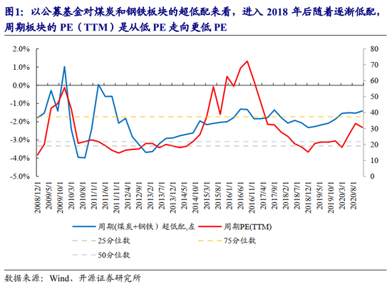 尽管市场对周期股存在的“常识”是“高PE买,低PE卖”,但实际上会发现自2018年以来,周期股长期处于一个低PE的区间之中,即使在2020年由于疫情造成了一个不常见的“周期底部”,周期股PE快速上升,但此时投资者也并未认为这是一个“买点”而大举买入。