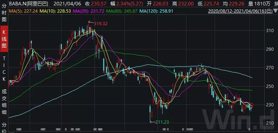 2020年10月底,阿里巴巴触及300美元/股之后,持续下跌,截至今年3月31日,股价累计跌幅为22%。