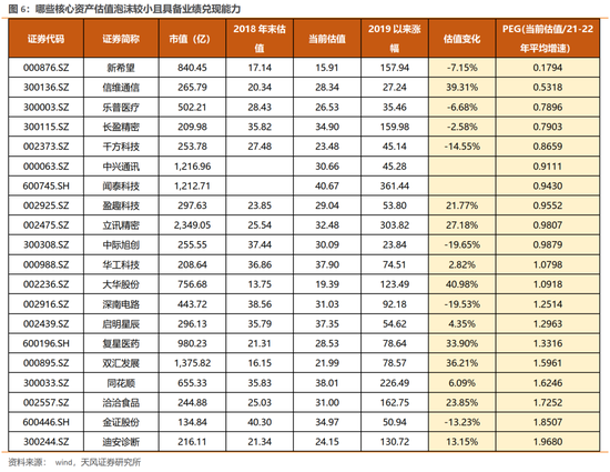 在天风策略构建的“核心100”成分股中我们作以下筛选:①剔除估值为负的个股(亏损个股);②19年以来涨幅为正,但估值变化幅度低于50%的;③按照当前估值和21-22年年预测平均净利润增速计算,PEG<2且为正的(需要说明的是,业绩预测会随分析师调整而变动,且有一定滞后性)。通过筛选得到下表: