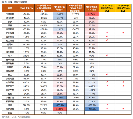 业绩在20Q4大幅改善的主要有以下几类:一是受益于疫情中段海外消费需求大幅提升的消费品,最典型的是家电、纺织服装。二是受益于生产端逐步修复的上中游设备和原材料,包括机械、电气设备、化工、有色等。三是景气底部改善的TMT,如计算机、传媒。