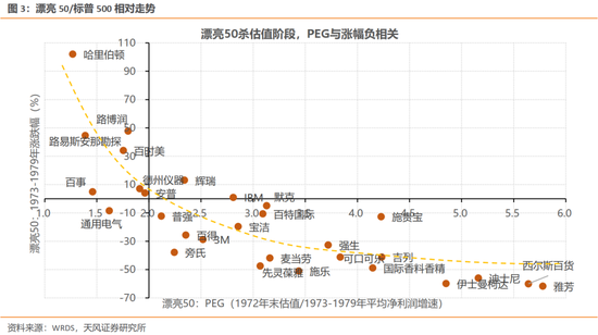 以PEG(1972年末估值/1973至1979年均净利润增速)和这一阶段涨跌幅作对比,可以更清晰地反映这一关系。PEG处于1-2之间的、估值泡沫较低的个股,在杀估值阶段基本仍维持正收益。