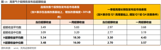 市场表现来看,一季报预告景气持续改善或高增的个股,在公告发布后当天及一周,能够取得一定的超额收益。如果叠加景气持续改善&一季报高增两个条件,则超额收益更加显著。