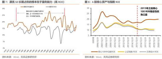 此外,正如1980年之后漂亮50长期占优的经验所展示的,核心资产长期取胜的真正关键在于高且稳定的盈利能力(ROE)。从A股数据来看,核心资产和大盘指数ROE水平在11-14年处于收敛状态,15年之后逐步分化且目前未观察到趋势扭转,这一现象与11年以来的市场风格基本是吻合的。一定程度上也意味着,当前市场彻底脱离核心资产而整体向中小风格切换的概率较低。