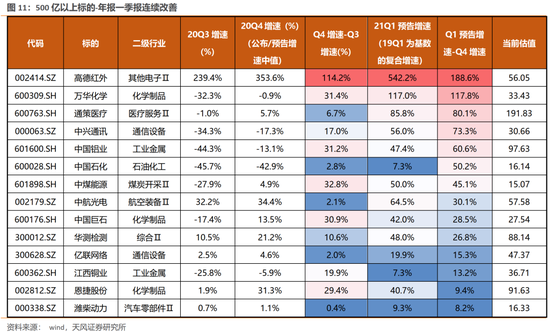 ③500亿以下:景气连续改善&一季报高增行业分布。结果显示,化工、电子、医药、电气设备行业高景气个股较多,有望成为下一阶段“逆袭”的中小市值个股的主要来源。
