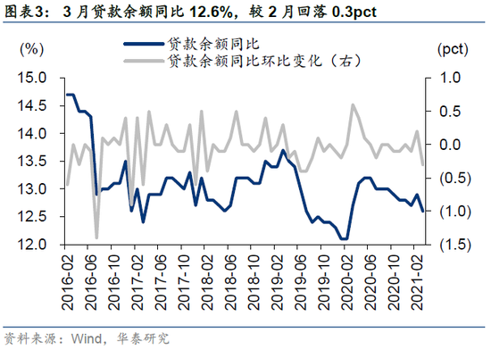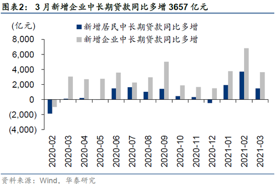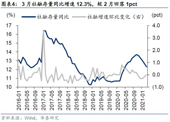 3月,社融增速环比趋缓,规模同比少增、但相比2019年同期仍多增。3月新增社融为33400亿元,低于Wind一致预期(36000亿元),新增人民币贷款为27300万亿元,高于Wind一致预期(25038亿元);社融存量同比增速12.3%,较2月回落1个百分点,贷款余额同比12.6%,较2月回落0.3pct。信贷结构继续向好。3月,企业中长期贷款新增1.33万亿元,同比多增3657亿元,中长期贷款占比83%,显著高于2018年来同期,反映制造业资本开支强劲;新增居民中长期贷款为6239亿元,高于去年同期的4738亿元,表明房贷需求仍具韧性。M1、M2双双回落,M2-M1剪刀差亦回落。3月,M2同比增速9.4%,较上月回落0.7pct,M1增速从7.4%回落至7.1%,M2-M1剪刀差相比2月回落0.4pct。