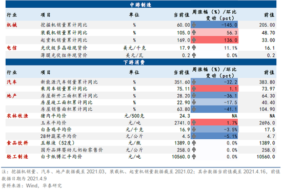 3月社融增速环比趋缓,规模同比少增、但相比2019年同期仍多增;企业中长期贷款同比多增且中长期占比显著高于近三年同期,反映制造业资本开支强劲;居民新增中长期贷款同比多增,房贷需求仍具韧性。3月,工业增加值增速低于Wind一致预期(14.1% VS 17.6%);对比2020-21年平均增速,基建/制造业/消费需求边际改善。截至4.17,21Q1财报披露率36%,有色/钢铁/基础化工/电新等相比19Q1/20Q1/20Q4净利增速均较高;我们在4.13发布的报告《业绩预告:从首尾分化,到盈利扩散》指出,20年报&21Q1业绩预告反映两大趋势:首尾企业分化缓和,盈利改善扩散至中上游。