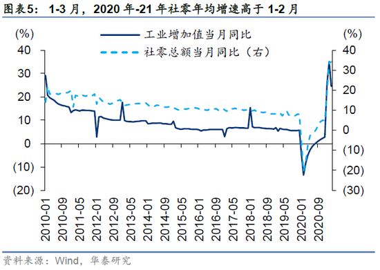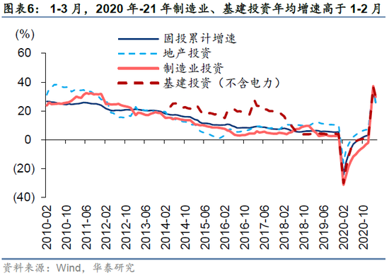 基建、制造业、社零需求边际改善。3月工业增加值同比增速为14.1%,低于Wind一致预期(17.6%),2020年-2021年平均增长6.2%,低于2月的6.3%。1-3月固定资产投资累计同比25.6%,2020年-2021年平均增长2.7%,高于1-2月的1.0%;其中,房地产投资2020年-2021年平均增长7.7%,高于1-2月的7.6%,制造业投资2020年-2021年平均增长-1.5%,高于1-2月的-3.0%,基建投资2020年-2021年平均增长2.1%,平均增速由负转正(1-2月-2.4%)。1-3月社零增速33.9%,2020年-2021年平均增长4.1%,高于1-2月的3.1%。