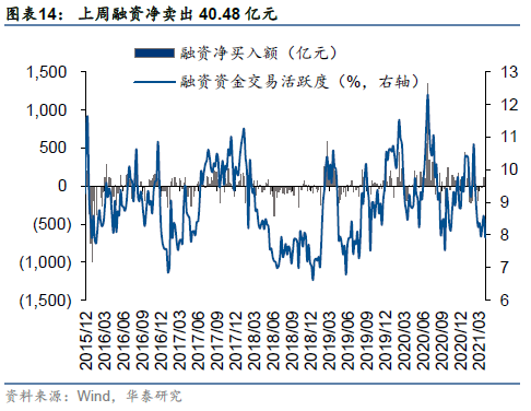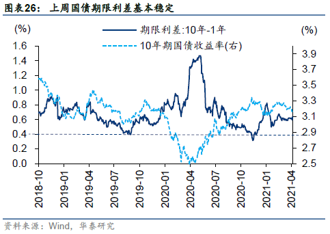 上周,A股继续缩量震荡,日均成交额为年内新低,中证500跑赢沪深300,市场交易主线不清晰,核污排放、二胎、数字货币、智能汽车等事件驱动型主题投资表现略好。近期外资负债成本和机会成本降低——美债长端利率和美元指数回落,但估值压制因素的短期减压和Q1业绩的陆续披露暂未明显提振市场情绪。当前茅指数PE-TTM(2021.4.16)为2010年以来94%分位数水平,我们认为市场仍处于结构的“拉锯战”阶段,我们1.31指出《期限利差走阔之下加配中证500》,4.9判断《Q2:仍在右侧,以小胜大》。