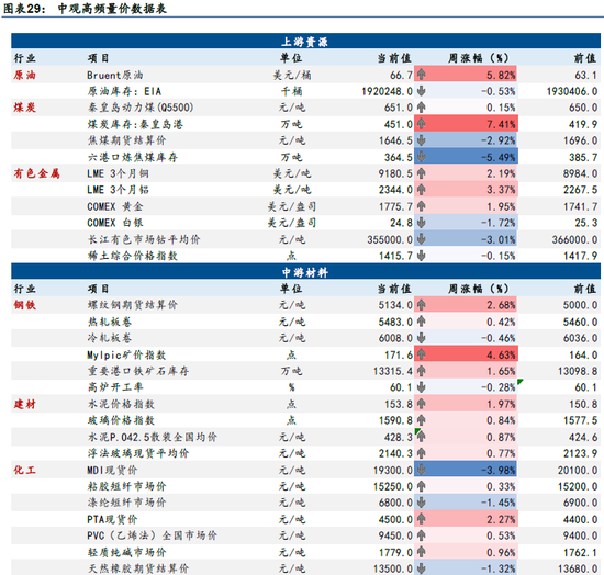 上周,国际原油、工业金属、螺纹钢、铁矿石、水泥、玻璃、PTA等价格环比上涨。