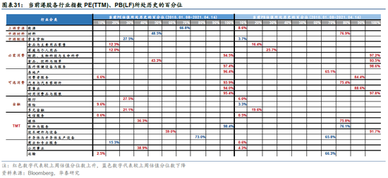 H股估值方面,上周食品、饮料与烟草(+1.8pcts)、公用事业(+1.7pcts)、银行(+1.3pcts)、技术硬件与设备(+1.1 pcts)、耐用消费品与服装(+1.0 pcts)板块PE估值分位数提升幅度居前,半导体与半导体生产设备(-1.5pcts)、软件与服务(-0.2pcts)、能源(-0.1pcts)、材料(-0.1pcts)、资本货物(-0.1pcts)板块PE估值分位数下降幅度居前;媒体(+8.1pcts)、食品与主要用品零售(+3.4pcts)、能源(+2.0pcts)、汽车与汽车零部件(+1.9pcts)、技术硬件与设备(+1.6pcts)板块PB估值分位数提升幅度居前,半导体与半导体生产设备(-2.8pcts)、运输(-2.5pcts)、软件与服务(-0.6pcts)、资本货物(-0.3pcts)、保险(-0.2pcts)板块PB估值分位数下降幅度居前。从绝对估值分位数来看,目前制药、生物科技与生命科学(94.5%)、房地产(96.4%)、医疗保健设备与服务(97.4%)、耐用消费品与服装(95.4%)、汽车与汽车零部件(93.9%)、零售业(94.0%)板块PE估值分位数处于历史较高水平(≥90.0%),制药生物科技与生命科学(97.2%)、医疗保健设备与服务(98.6%)、耐用消费品与服装(97.8%)、食品饮料与烟草(93.5%)、技术硬件与设备(91.7%)PB估值分位数处于历史较高水平(≥90.0%);能源(8.6%)、资本货物(3.7%)、银行(6.0%)、保险(3.3%)、电信服务(0.5%)、商业和专业服务(0.6%)、公共事业(4.3%)板块PB估值分位数处于历史较低水平(≤10.0%)。