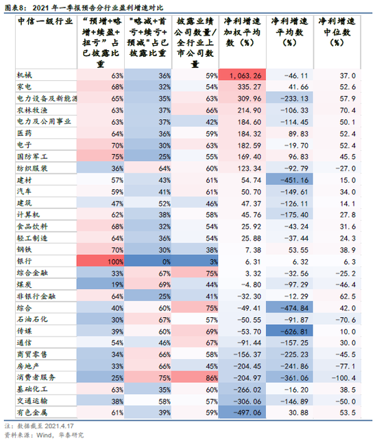 我们在4月13日发布的报告《业绩预告:从首尾分化,到盈利扩散》中指出,2020年年报和2021年一季报业绩预告显示两大趋势:一是全A企业盈利结构上,首尾分化现象缓和,盈利改善从头部企业向尾部企业扩散;二是在基数效应、景气扩散的带动下,盈利由中游制造与消费板块,向中上游企业扩散,中上游企业业绩弹性显现。